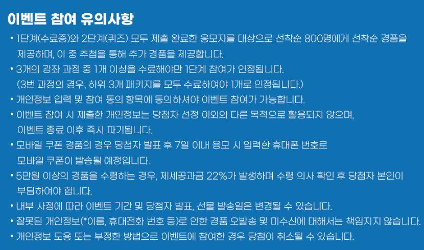 열린관광 온라인 교육 수강은 관광e배움터를 통해서 강좌를 진행할 수 있고, 수강 완료 후 수료증 제출을 하면 선착순으로 이벤트에 참여하여 경품을 수령할 수 있습니다.