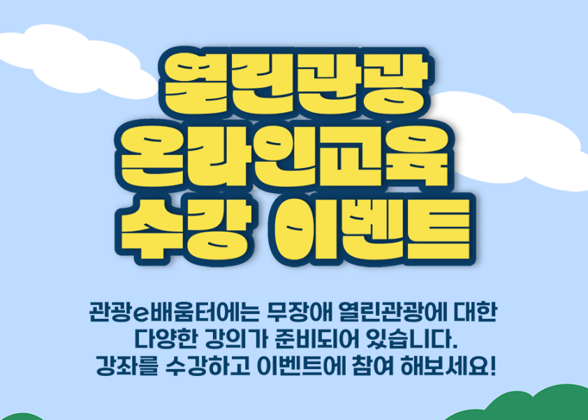 장애인, 고령자, 임산부 등 관광취약계층도 자유롭게 관광활동을 하는 열린관광을 이해하기 위해 온라인 교육을 받으면서 동시에 이벤트도 참여할 수 있습니다.