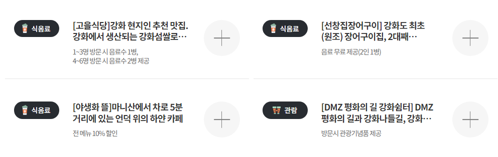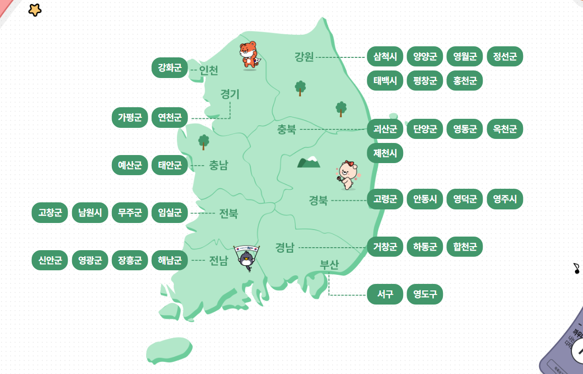 대한민국 구석구석 사이트에서 전국 지도를 통해서 각 지역의 혜택을 목록별로 간단히 확인할 수 있으니 직접 사이트를 방문하여 확인해보는 것이 좋습니다.