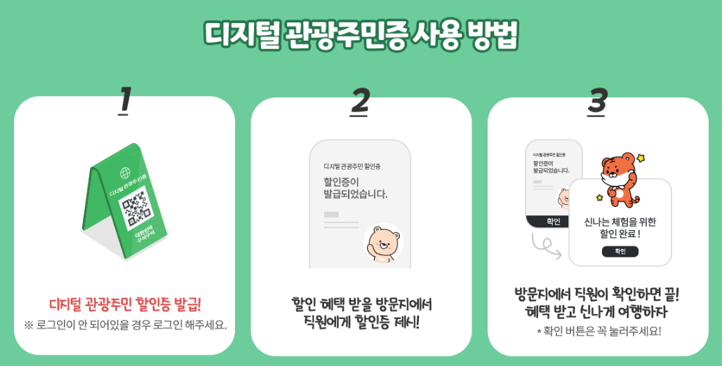 발급받은 디지털 관광주민증을 가지고 할인 혜택을 받을 수 있는 방문지의 직원에게 제시하게 되면 QR스캔을 통해서 확인 후 혜택을 받을 수 있으니 직접 발급받고 확인해 보는 것이 좋습니다.