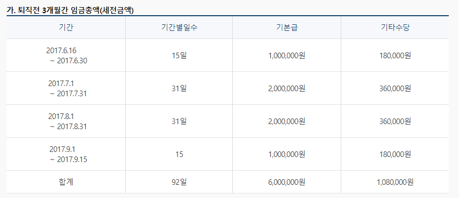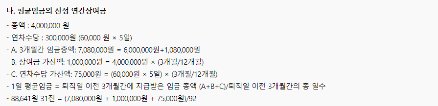 계산의 기본은 퇴직 직전 3개월 동안의 평균임금을 기준으로 합니다. 이 평균임금은 해당 기간 동안 지급된 임금의 총액을 그 기간의 총일수로 나눈 금액으로 산정됩니다.