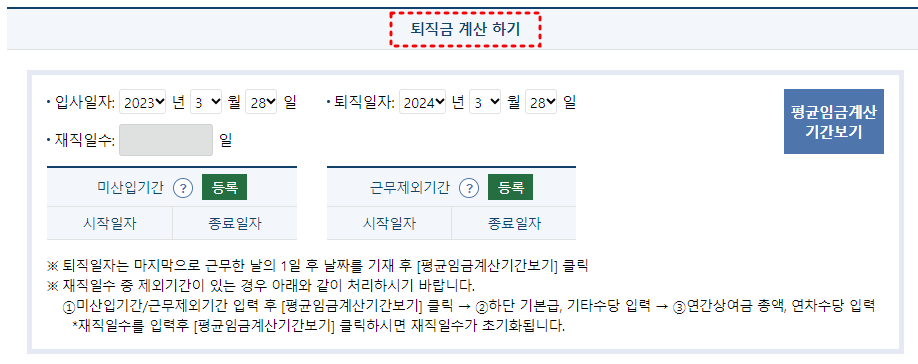 평균임금 산정 시에는 퇴직일을 포함시키지 않지만, 계속 근로년수에는 포함시켜요. 예를 들어, 입사일이 기산일이 되고, 퇴직일이 마감일이 돼요.