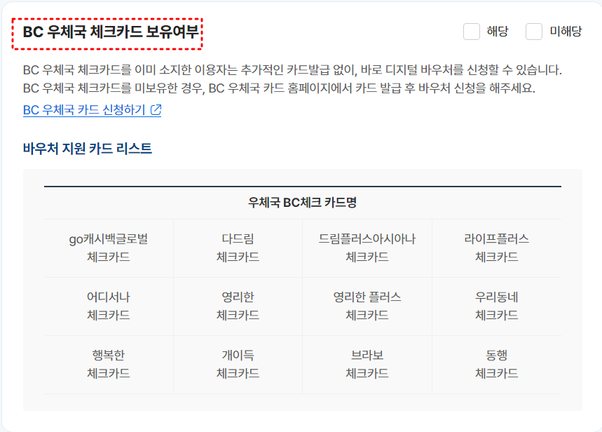 또한, 우체국BC 체크가드를 발급(보유)하고 있어야 합니다. 이 세 가지 조건을 모두 만족해야 디지털 바우처를 신청할 수 있어요.