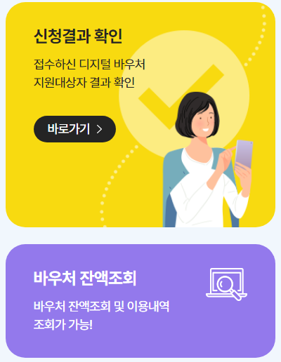 바우처의 신청 및 신청결과 조회, 그리고 잔액조회 등을 이용하려면 디지털 바우처 홈페이지에서 신청 및 조회할 수 있습니다.