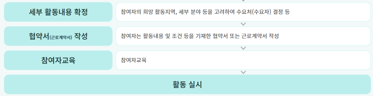 희망활동 지역과 세부 분야 등을 고려하여 결정이 이루어지고, 선발된 지원자에게는 협약서가 작성됩니다. 이어서 근로계약서가 작성되면 해당 지원자들은 교육을 받게 됩니다.
