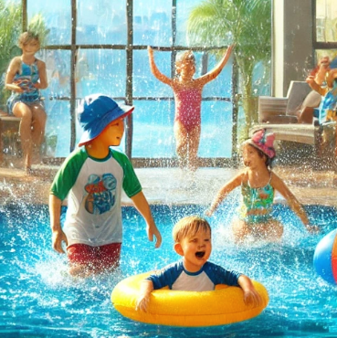 이 수영장은 햇볕이 강한 낮 시간에도 쾌적하게 물놀이를 즐길 수 있도록 차양막이 설치되어 있어요.