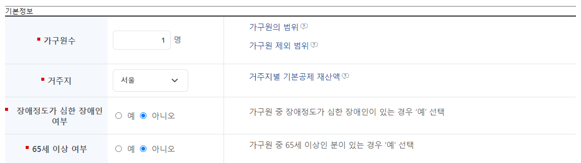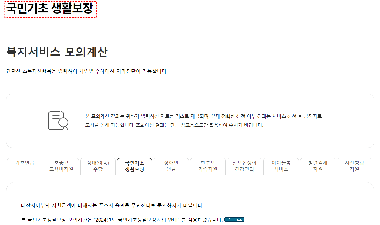 기본적인 소득과 재산 정보 등을 입력하면 간단하게 기초생활수급자 생계급여 자격여부를 확인할 수 있으며, 결과값을 가지고 읍면동 주민센터에 문의하시는 것이 좋을 것 같습니다.