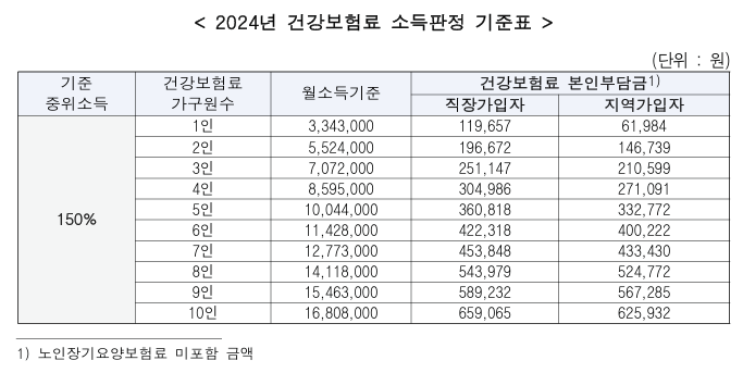 소득 기준도 있어요. 가구당 기준 중위소득의 150% 이하여야 하며, 이는 신청인의 가구 건보료 고지 금액이 2024년 건보료 소득판정 기준표상의 기준 중위소득 150% 이하라는 것을 의미해요. 따라서 신청 전에 건보료 고지 금액을 미리 확인하는 것이 좋아요.