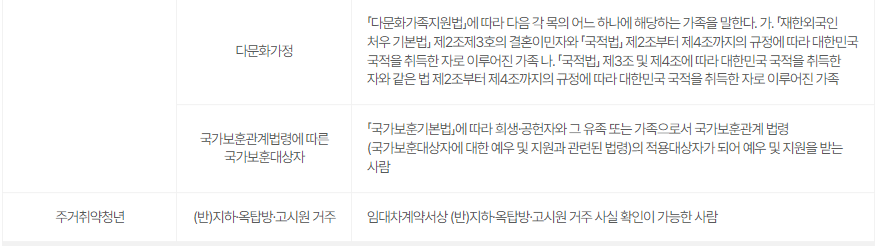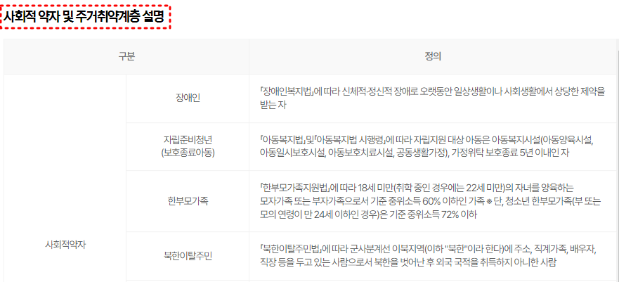 사회적 약자에는 장애인, 자립 준비 청년(보호 종료 아동), 한부모 가족, 북한 이탈 주민, 다문화 가정, 국가 보훈 관계 법령에 따른 국가 보훈 대상자가 포함되며, 주거 취약 청년에는 (반)지하, 옥탑방, 고시원 거주 청년이 포함돼요.