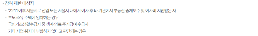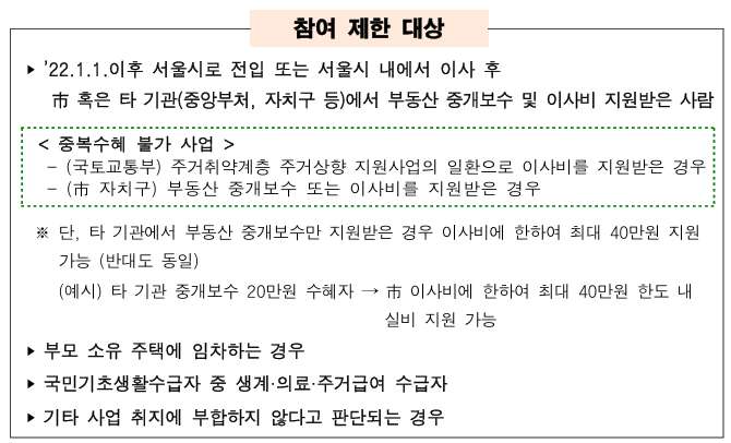 2022년 1월 1일 이후 서울시로 전입했거나 서울 내에서 이사한 후 서울시 혹은 타 기관에서 부동산 중개보수 및 이사비를 이미 지원받은 경우, 중복 수혜는 불가능해요.