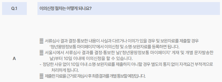 서류 심사 결과에 대해 이의가 있을 경우, 청년몽땅정보통 마이페이지에서 이의 신청 및 소명·보완자료 등록이 가능합니다.