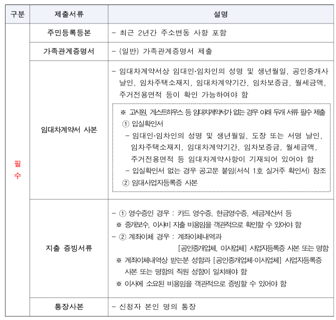 공공기관에서 발급받은 제출 서류는 신청일 이전 1개월 이내 발급받은 서류로 제출해야 하니, 서류 발급 시기를 잘 조정하는 것이 좋아요.