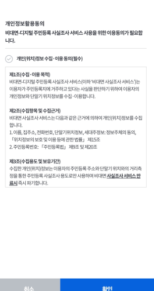 2024년 주민등록 비대면 사실 조사를 진행할 때는 참여자가 주민등록지에 거주하고 있다는 사실을 확인하여야 하기에 GPS 기능을 켜고 참여해야 하는 점을 기억해야 합니다.