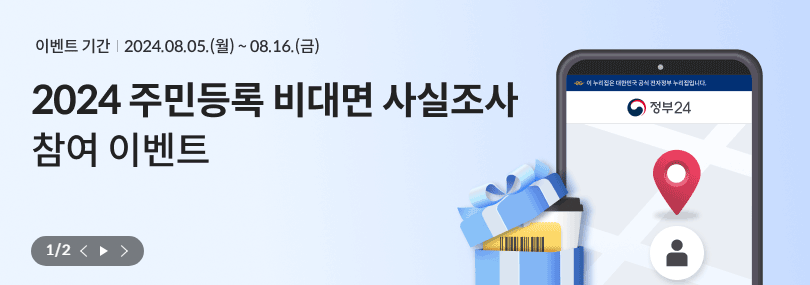 2024년 8월 5일(월)부터 16일(금)까지 주민등록 비대면 사실조사를 참여를 완료한 모든 사람은 이벤트에 응모하여 경품을 받을 수 있습니다.