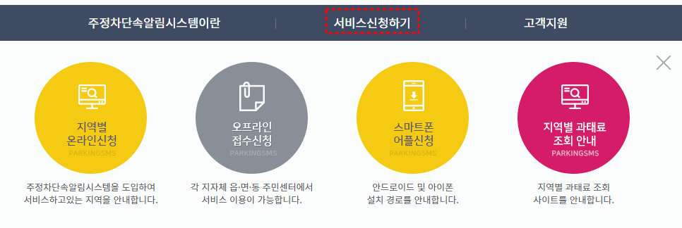 지역별 온라인 신청으로 진행하기 위해 홈페이지에서 선택하면, 각 지자체가 운영하는 주정차단속 문자일림 서비스 사이트로 바로 이동하실 수 있습니다.