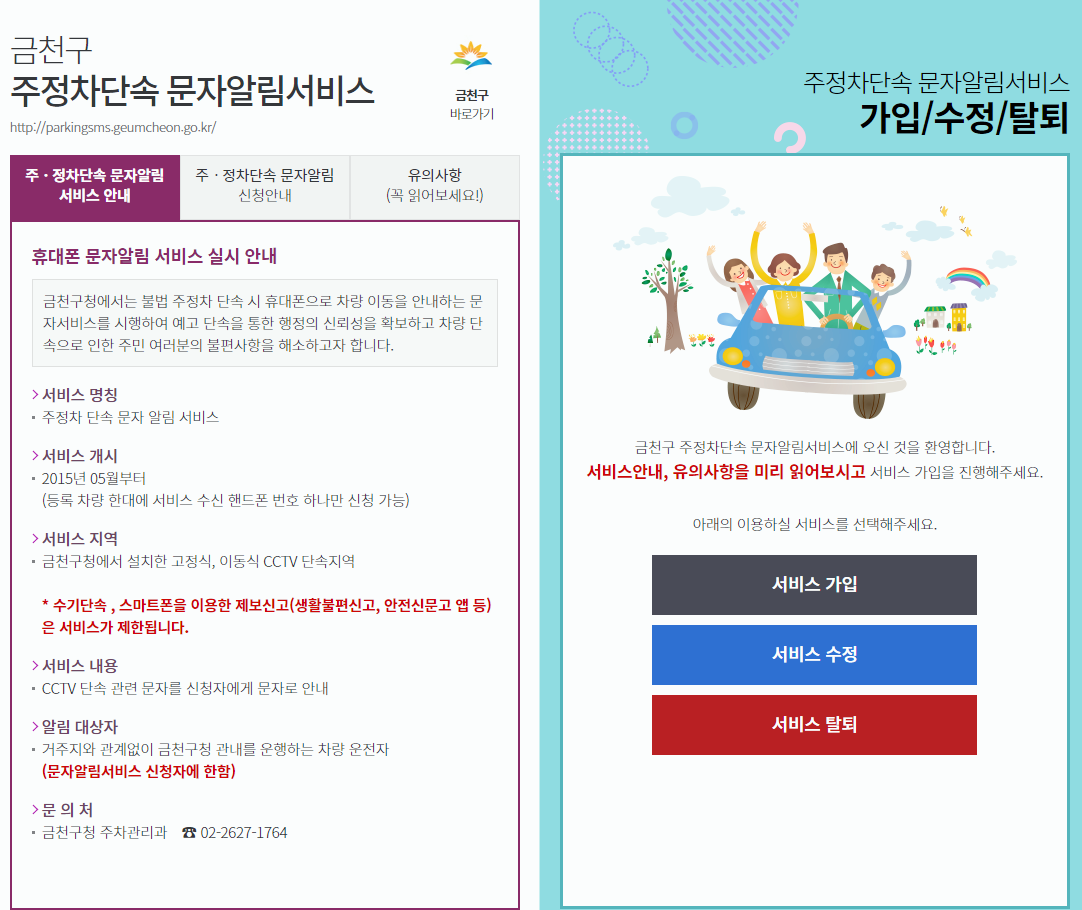 서비스에 대한 안내 사항 및 유의사항을 꼼꼼히 읽어보고 진행하시기 바라며, 여기에서 주정차단속 문자알림 서비스의 가입, 수정, 탈퇴를 모두 진행할 수 있습니다.