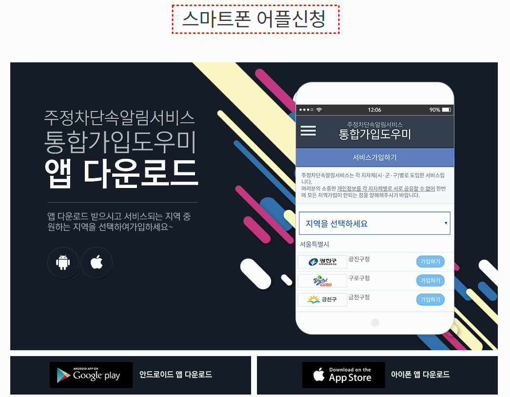 스마트폰 어플을 통한 신청으로 진행하시려면, 홈페이지에 안내하는 어플을 설치하고 원하는 지역을 검색하여 선택하고 신청 및 가입을 진행할 수 있습니다.