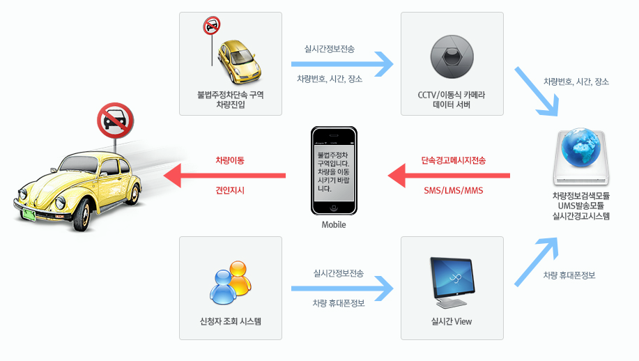 불법주정차단속 구역으로 차량이 진입하면 CCTV가 인식하여 차량번호, 시간, 장소를 실시간 경고 시스템으로 보내면, 이 시스템이 서비스 신청자의 정보를 확인하여 경고문자를 보내게 됩니다.