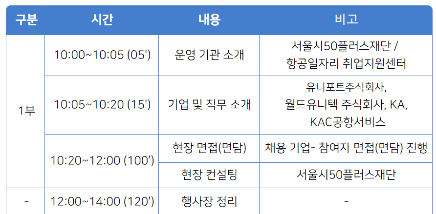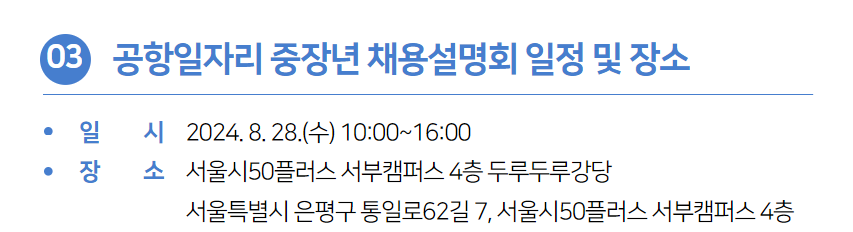 또한 대부분의 공항일자리 직무를 당일 현장면접을 진행하기 때문에 바로 채용이 될 수 있는 좋은 기회이므로 중장년 일자리 채용설명회를 놓치지 않고 참여하는 것이 좋습니다.