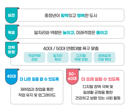 이 프로젝트는 40대에게는 직업 역량을 강화할 수 있는 다양한 기회를 제공하며, 50대에게는 더 오래 일할 수 있도록 맞춤형 지원을 제공하고 있어요.
