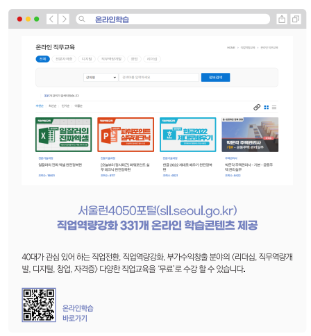 서울런4050은 온라인 학습을 통해 직업 역량 강화를 지원하는데, 서울런4050 포털(sl.seoul.go.kr)에서 다양한 직업교육 과정을 무료로 수강할 수 있어요.
