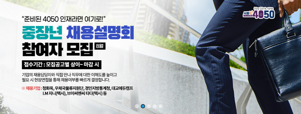 서울시 50플러스 포털에 접속하면 통계조사원, 공항일자리 등 다양한 중장년 일자리 채용설명회의 상세 내용을 직접 확인할 수 있습니다.