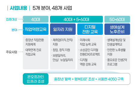 이 프로젝트는 40대에게는 직업 역량을 강화할 수 있는 다양한 기회를 제공하며, 50대에게는 더 오래 일할 수 있도록 맞춤형 지원을 제공하고 있어요.