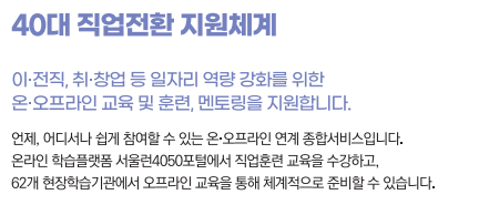 서울런4050의 40대 직업 전환 프로그램은 중장년 40대를 위한 온-오프라인 연계 종합 서비스로, 전환기에 있는 중장년층의 직업 역량 개발 요구와 트렌드를 반영한 유망 분야를 선정하여 체계적인 학습을 지원해요.