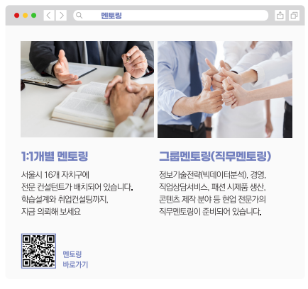 경력 전환 컨설턴트와 함께하는 1:1 멘토링과 직업 전환 유망 분야에 진입할 수 있도록 도와주는 그룹 멘토링이 준비되어 있답니다.