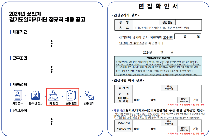 경기도 청년면접수당으로 받기 위해서는 채용공고문과 면접확인서 두 가지 증빙서류를 준비해야하며, 면접 1건당 면접신청서 1건을 제출해야 합니다.
