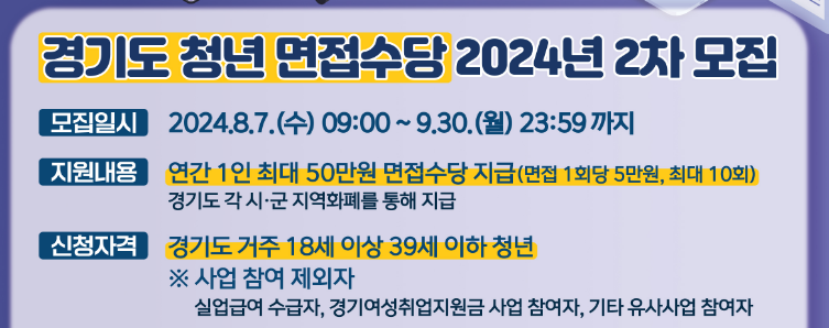 2024년 8월 7일(수) 9시부터 9월 30일(월) 23시 59분까지 경기도 청년면접수당 2차를 공식 홈페이지를 통해 온라인으로 신청할 수 있습니다.
