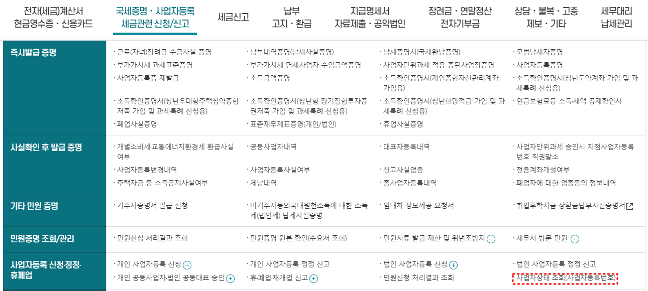 사업자등록번호를 조회하는 두 번째 방법은 홈택스에서 사업자등록 신청, 정정, 휴폐업 메뉴의 '사업자상태 조회'를 이용하면 확인할 수 있습니다.