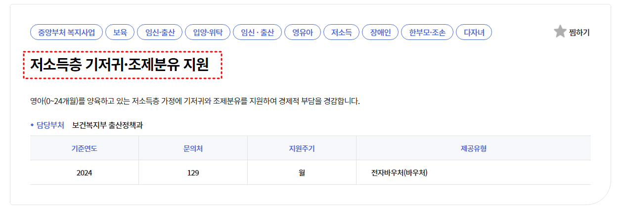 저소득층 기저귀·조제분유 지원이라는 복지서비스에서는 0~24개월의 저소득층 가구의 영아를 대상으로 기저귀(월9만원)와 조제분유(월11만원)을 바우처 포인트로 제공받을 수 있습니다.